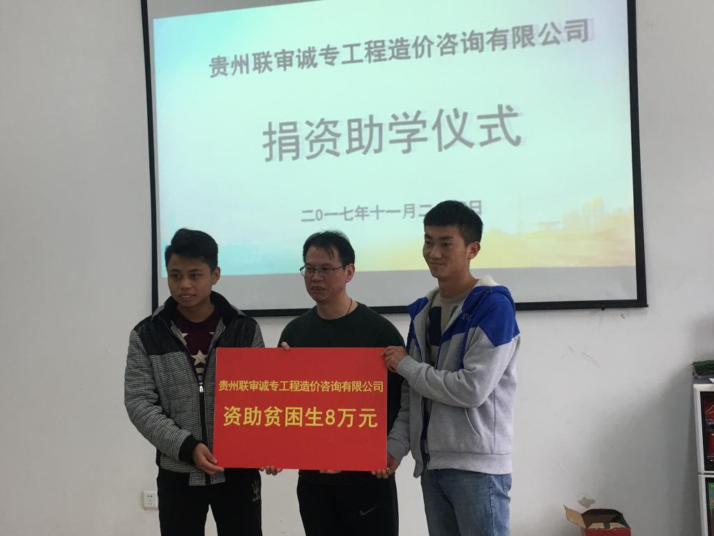 最后,民建贵阳市委副主委徐朝刚在讲话中指出,贵州联审诚专工程造价咨询有限公司在蒸蒸日上之时,不忘感恩回报社会,帮助家庭经济困难的大学生完成自己的学业。同时,希望受资助的学生能珍惜来之不易的学习机会,常怀感恩之心,严格要求自己,注重创新创业,全面发展,不断进取,早日成才。据悉,贵州联审诚专工程造价咨询有限公司今年在必赢网址bwi437共捐赠贫困助学金八万元、“三创”励志金两万元。